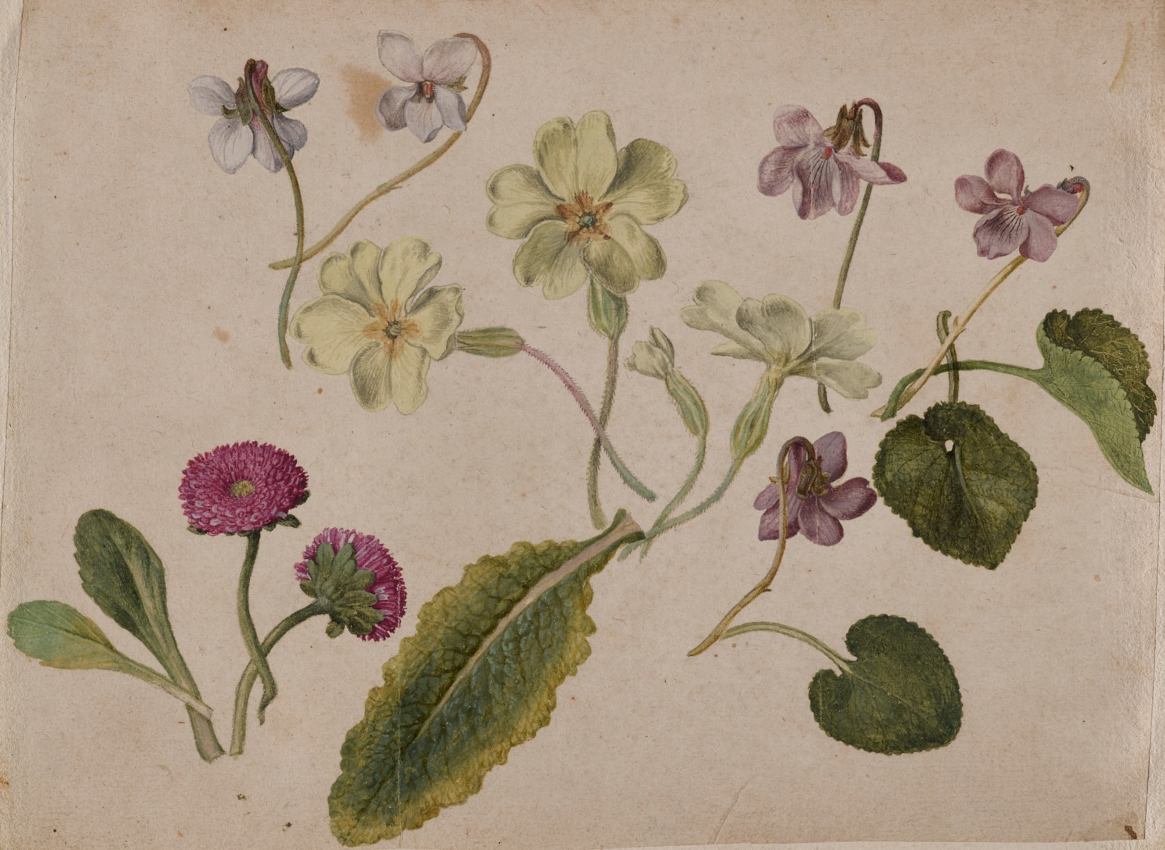 A sheet of studies of flowers: two double daisies, four primroses and five violets with separate studies of their leaves