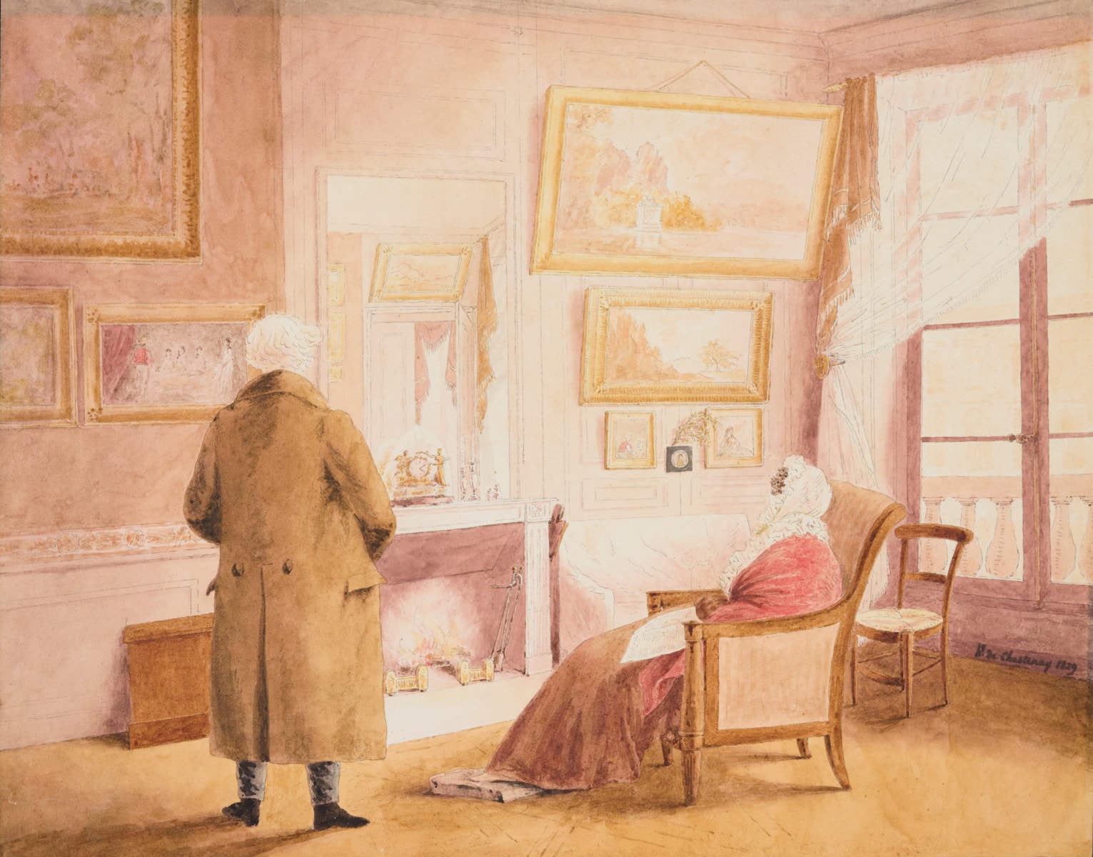This domestic scene depicts Charles-Joseph-Fortuné, Marquis d’Herbouville, and his wife, Marie Louise Victoire Le Bascle d’Argenteuil, in the salon of their private hotel at 87 Place du Palais Bourbon. Drawn in 1829 by the Marquis’ nephew, the politician, general and artist Henri-Louis de Chastenay de Lanty, the two figures are shown in the last year of their lives, facing a fire with their backs to the viewer. Some twenty years earlier, in c. 1804–6, the portraitist Gabriel Lemonnier (1743–1824) had depicted the Marquise with her children in a different interior, while in 1792 Lemonnier had painted a full-length portrait of the Comte, both of which are now in the Musée des beaux-arts de Rouen.