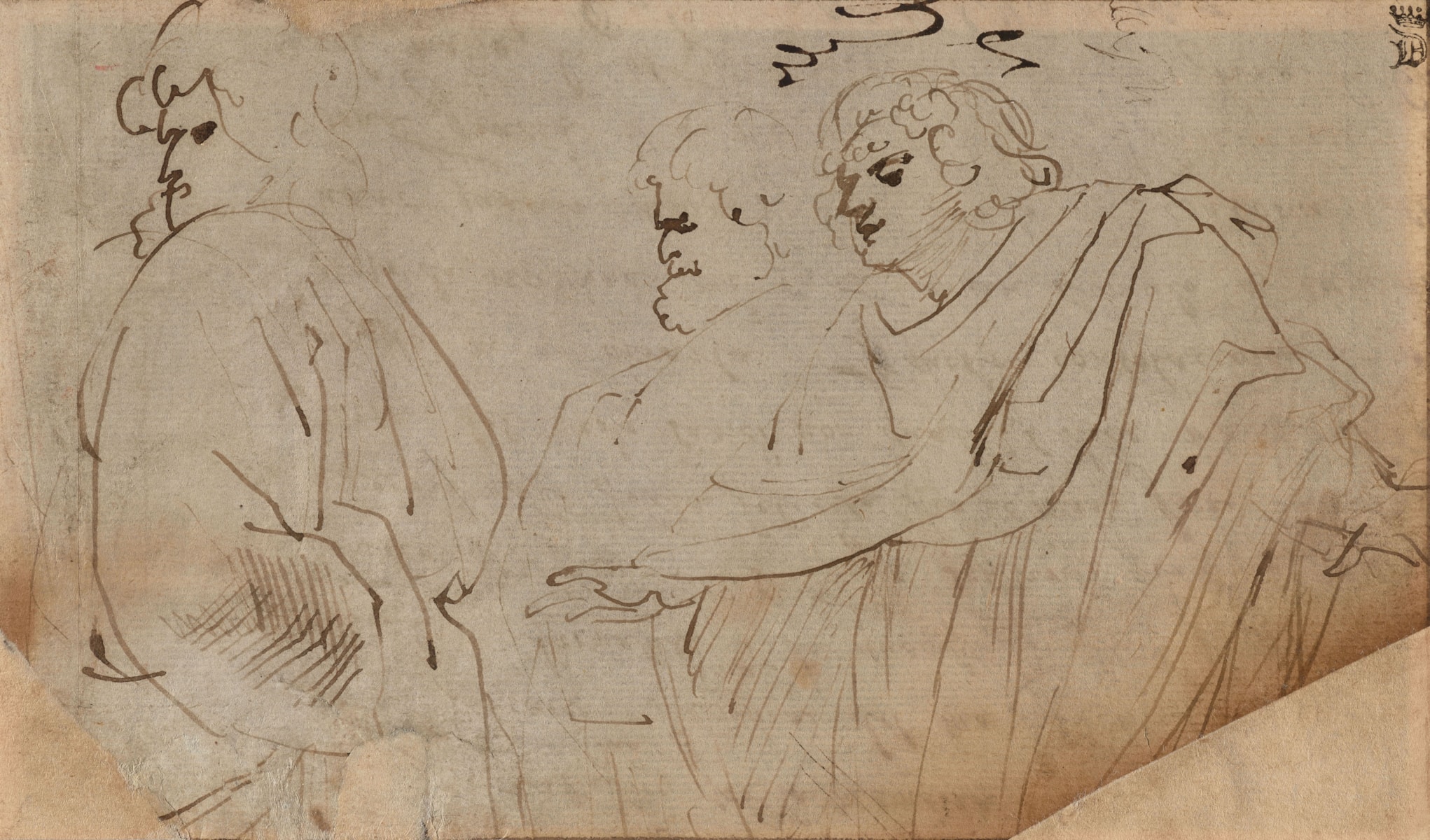 In 1600, Peter Paul Rubens, a promising yet unproven artist, left Flanders for the Italian peninsula where he would spend the following eight years. He travelled firstly to Venice, before settling in Mantua where he was employed at the court of Vincezo I Gonzaga, Duke of Mantua. With Gonzaga’s support, Rubens spent time in Rome, Genoa and Valladolid in Spain, and from late 1605 until late 1608 he acted as the duke’s agent in Rome sourcing art for the ducal collections. This double-sided sheet, with a confident and laconic study of three figures on the recto and a letter dated to September 1607 on the verso, attests both to Rubens’ growing confidence in his graphic skill and to his courtly role with the Gonzaga. The verso contains a fragmentary draft of a letter which does not survive, used to rehearse Rubens’ wording. The letter consists of a courteous message to a painter who is carrying out a commission for the Duchess of Mantua, Eleonora de' Medici. The intended recipient has been convincingly identified Cristoforo Roncalli, il Pomarancio (1551/2–1626), with whom Rubens was close at the time, as attested by his surviving correspondence with Annibale Chieppio (1563–1623), Duke Vincenzo Gonzaga's secretary of state in Mantua. Pomarancio had been commissioned to paint a work for the private chapel of the duchess, and the negotiations proved to be Rubens’ final assignment from the Gonzaga, precipitating the souring of relations and his return to Flanders.