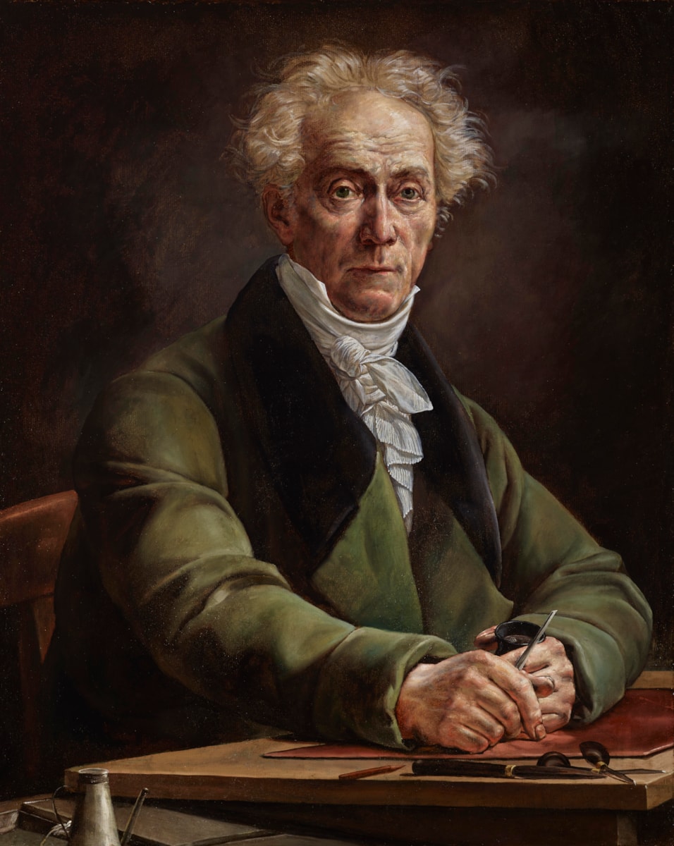 This painting has recently been identified as a portrait of the Strasbourg painter and engraver Christophe Guérin (1758–1831), by the sitter’s son Gabriel-Christophe Guérin (1790–1846) from 1822–5. Previously undocumented, the portrait’s existence was known through an engraving by Jean-Daniel Beyer (1785–1846), lithographed by Godefroy Engelmann (1788–1739) in 1825. The painting constitutes the sole confirmed portrait of the artist and a significant addition to Strasbourg’s artistic heritage. Shown in bust length against a dark background, the sitter, now in his sixties, wears a green coat and white cravat. His hands, dirtied with manual labour, rest on a copper plate, a burin held in one hand, a small pot in the other, with engraving tools laid out before him and a jug to the left, a detail which is not included in Beyer’s engraving.
