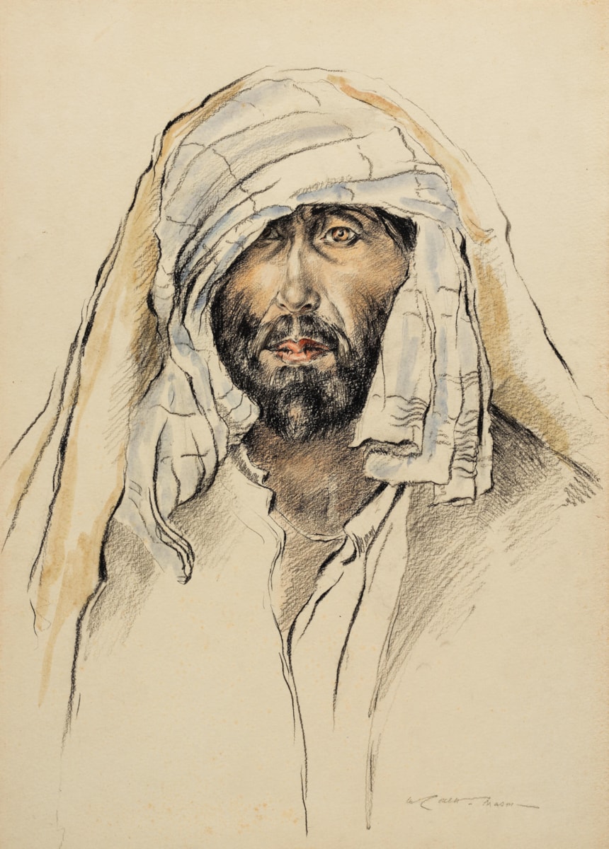 This remarkable series of nine portrait drawings provides a window into the lives and costumes of working men in Northwest India before the partition of 1947. Drawn in 1923 by the British artist-traveller, William Collett-Mason, the drawings are located in various cities in Balochistan and Punjab, regions that now form part of Pakistan but were then within British-ruled India. The sitters are identified, located, and described by the artist’s inscriptions, which note some of their occupations – soldiers and charcoal burners – their physical characteristics, and their personalities. One sitter, for example, is described as a “dandyish young man wearing a pink through his stock and an earring” [2]. His name is recorded as Dumah Khan (Rhau), while another man is identified as Pier marmuud (Pir Mahmood) [9]. The individual character of each sitter is expressed through unique poses and a varied graphic technique, with some sheets heightened in watercolour, others finished in bicolour.