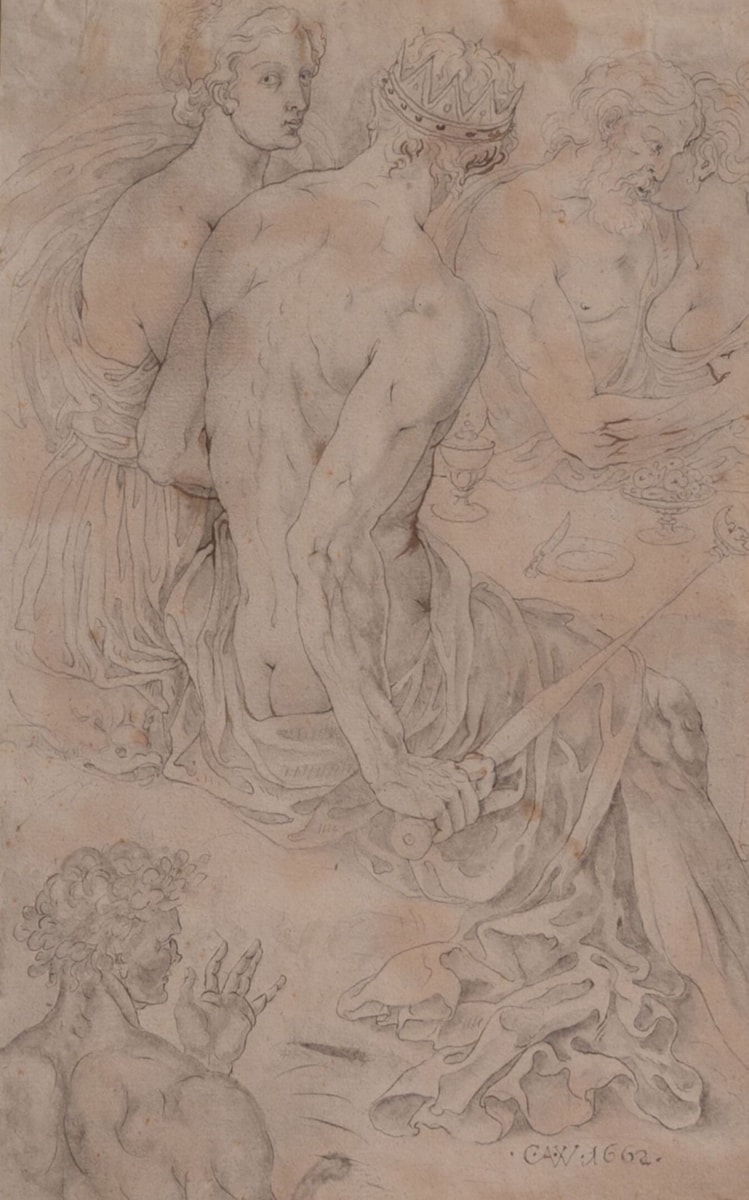 Drawings by the Dresden sculptor Christoph Abraham Walther are exceptionally rare, his entire graphic oeuvre comprising fewer than twenty known sheets. A small group of drawings unified by the ‘CAW[B]’ monogram was first assembled by Horst Vey in 1964 and tentatively attributed to an unknown member of the Couwenbergh dynasty. Werner Schade has since convincingly identified the monogram as that of Walther and several further drawings have been added to the initial group by Vey, Schade, and Lise Lotte Möller, while a final drawing appeared on the London art market in 1993. The present drawing has never been reproduced and is likely the one identified by Vey in 1965 as ‘Mythologische Gruppe’, dated 1602 and originating from the collection of Heinrich Lempertz Senior which was auctioned at J.M. Heberle in June 1900.
